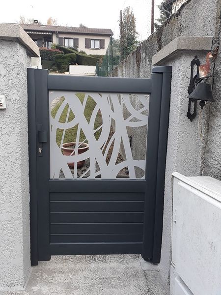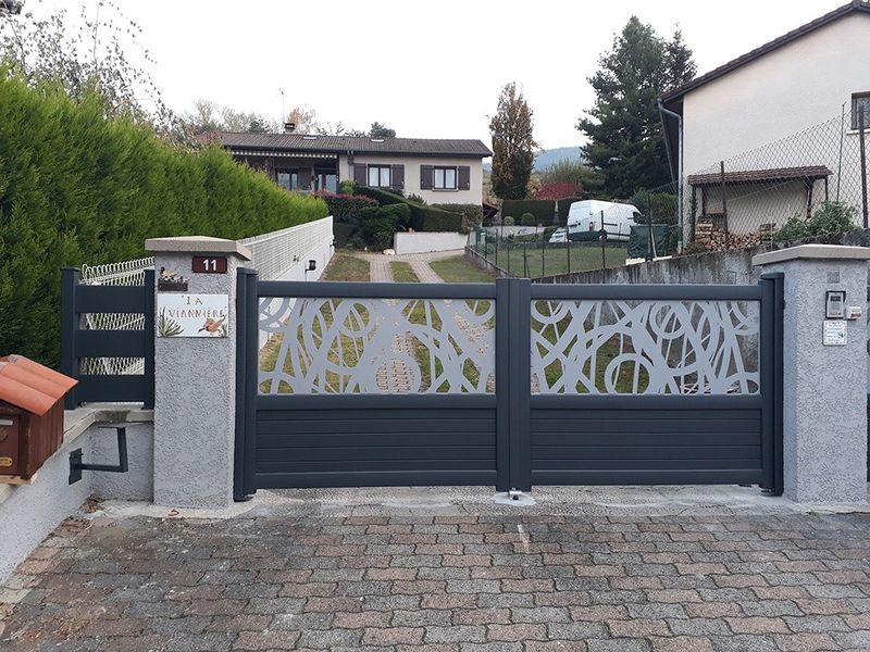 À Saint-Chamond, le client de ce pavillon a opté pour un portail alu bicolore (gris 7016 + 7040) avec un motif résille unique.
