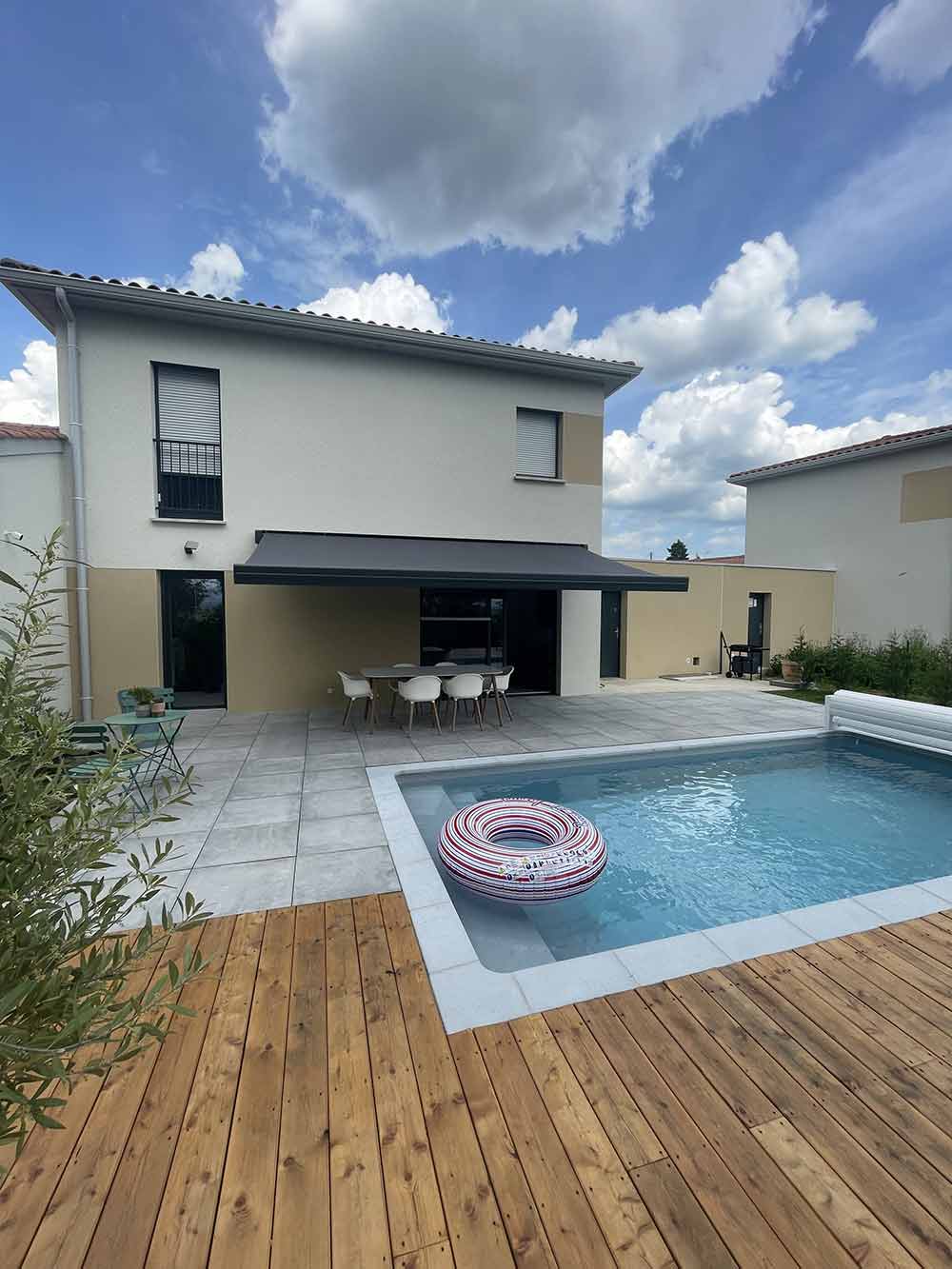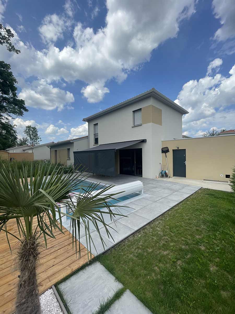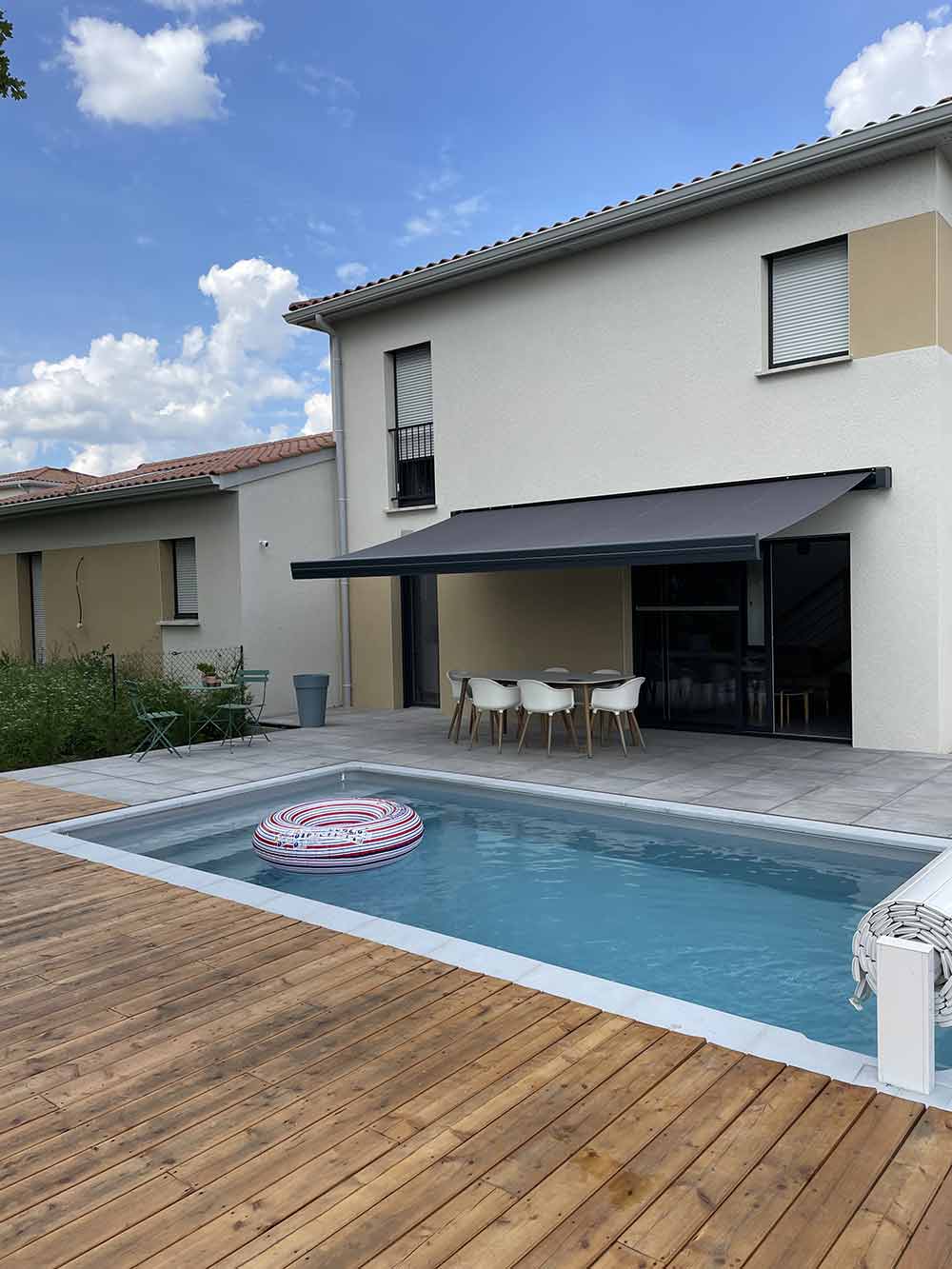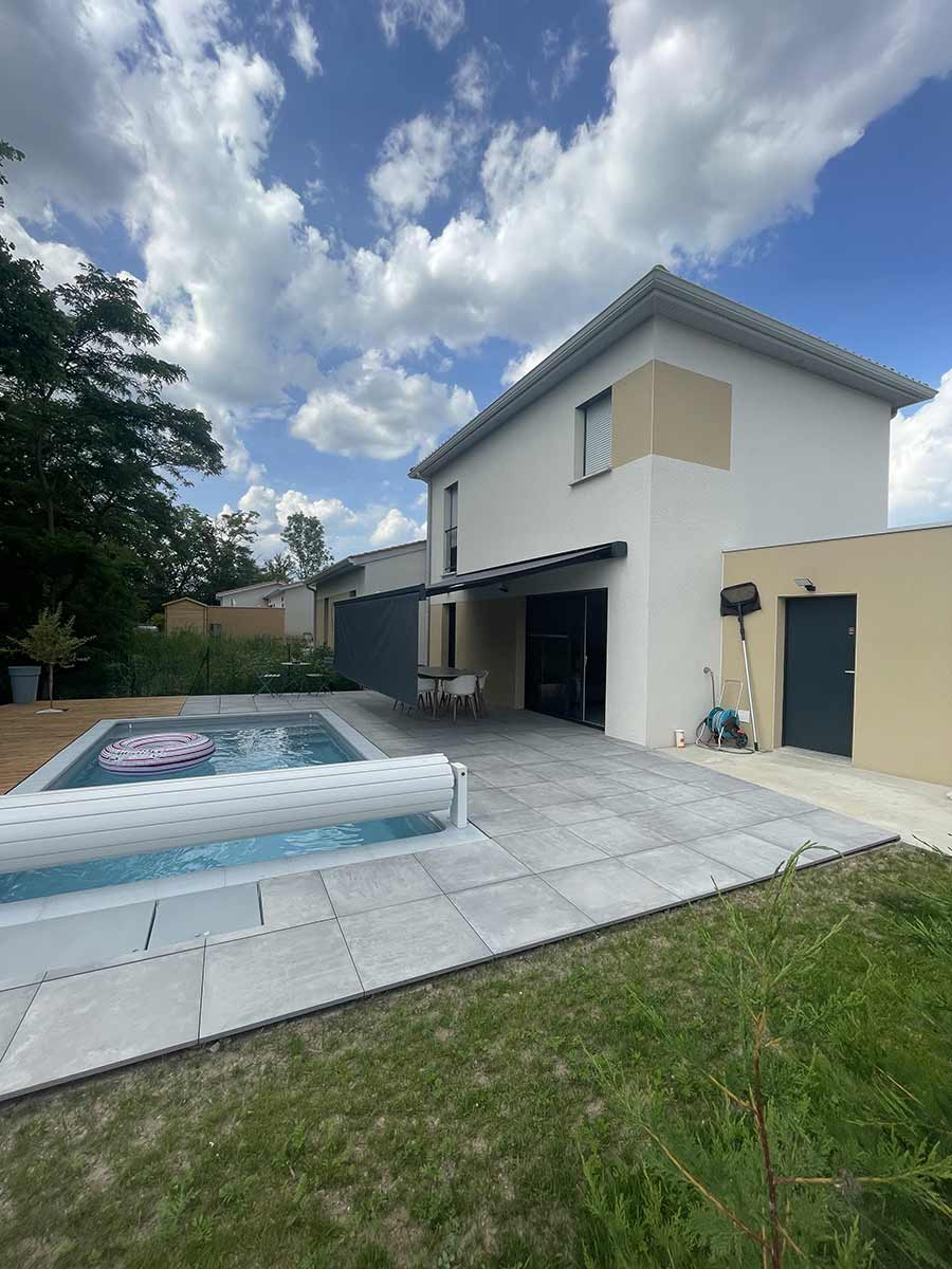 Installation d’un store extérieur modèle Horizon sans coffre, avec une largeur de 4000 mm et une avancée de 3500 mm. La toile utilisée est un modèle Dickson U709. Ce store, posé à Saint-Priest-en-Jarez, offre à la fois protection solaire et esthétisme pour la propriété.